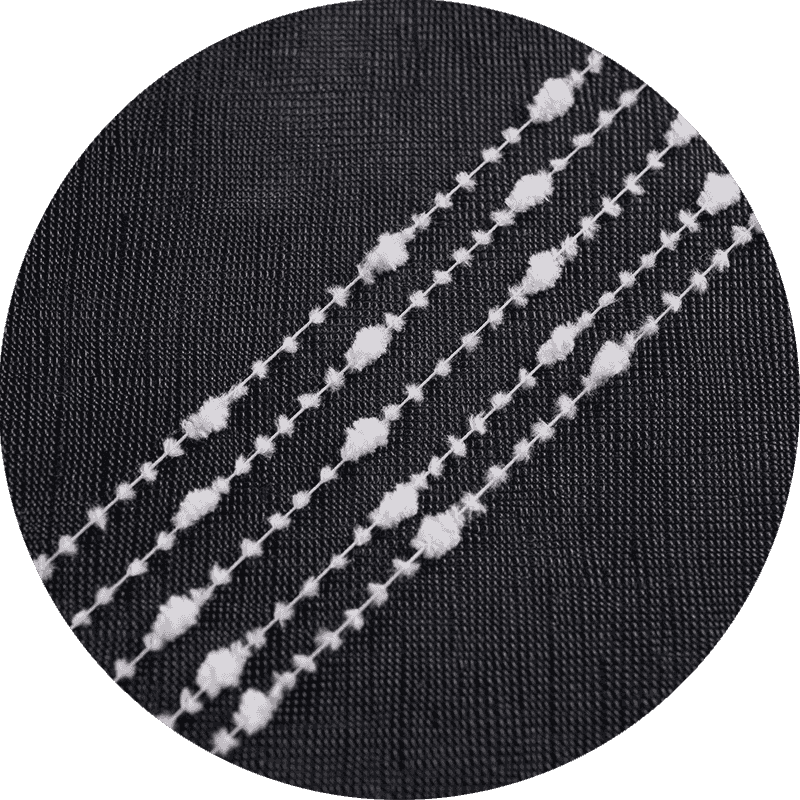 Síoda: Le haghaidh teagmháil luxurious, is minic a ionchorpraítear snáithíní síoda i snáth chrysanthemum. Ní hamháin go gcuireann síoda ar sheen snasta ach freisin feabhsaíonn sé go réidh agus go bog an snáth, rud a fhágann go bhfuil sé foirfe le haghaidh faisin agus gabhálais ard-deireadh. Ceadaíonn neart agus uigeacht mhíne an tsíoda dearaí íogair agus casta a dhéanamh, ag cur béime breise ar an bpatrún atá cosúil le criosantamaim sa snáth.